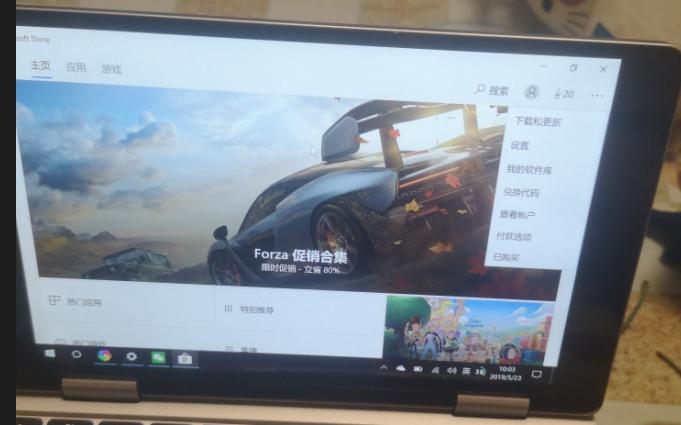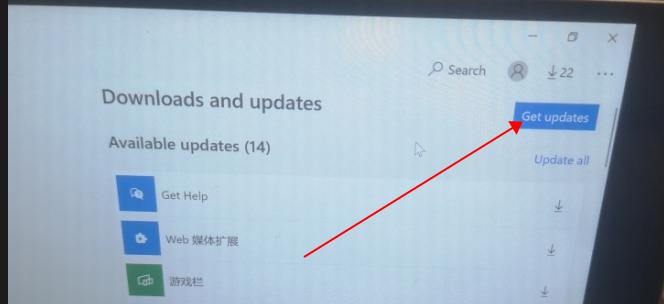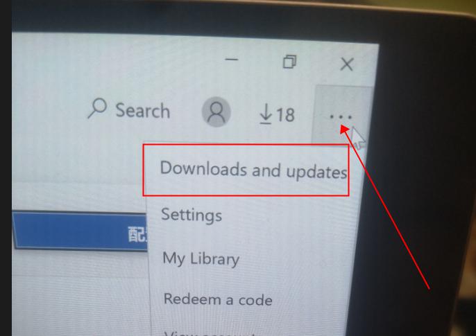4、應(yīng)用商店打開后如下圖所示,點擊右上方紅色箭頭所指三個小點,然后選擇紅色框里面的Downloads and updates。