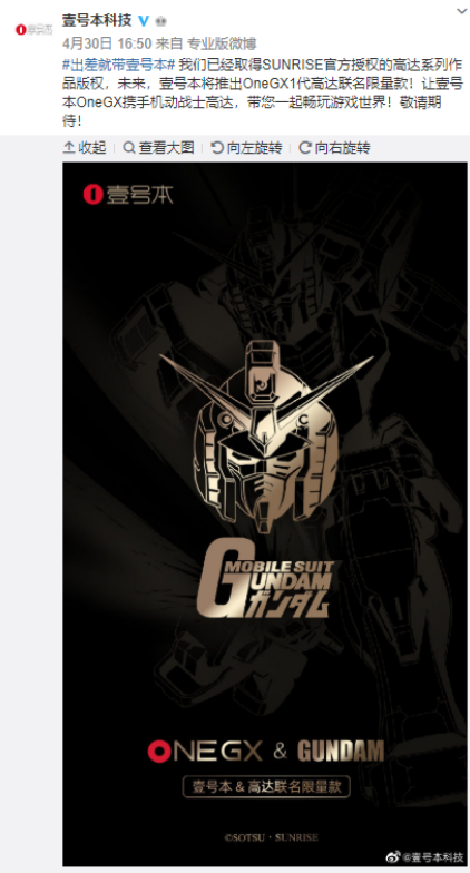 據(jù)壹號(hào)本官方宣布,壹號(hào)本目前已取得SUNRISE官方授權(quán)的高達(dá)系列作品版權(quán),將推出壹號(hào)本OneGX將發(fā)布高達(dá)聯(lián)名限量款!