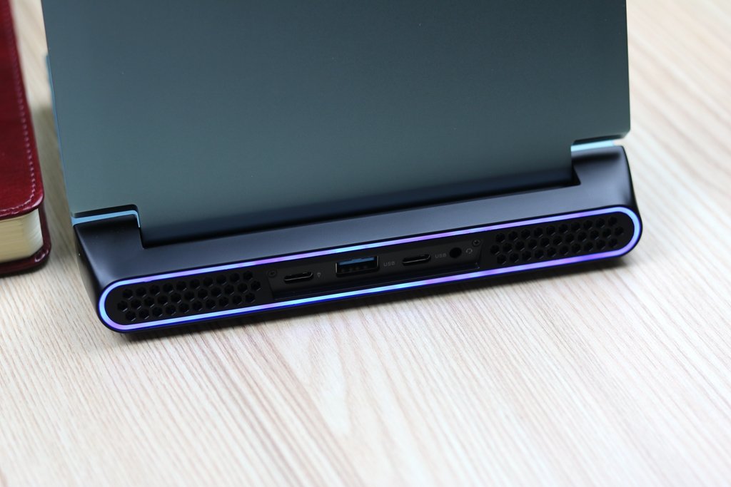 同樣炫酷的不只有鍵盤,在筆記本的尾部也有一圈環(huán)形尾燈,硬朗的線條搭配柔和的燈光,你會情不自禁的喜歡上這樣的產(chǎn)品。尤其是拿在手掌上打游戲的時候,燈光的渲染效果會讓你上癮,有些遺憾的是尾部環(huán)形燈不能調(diào)節(jié)顏色。