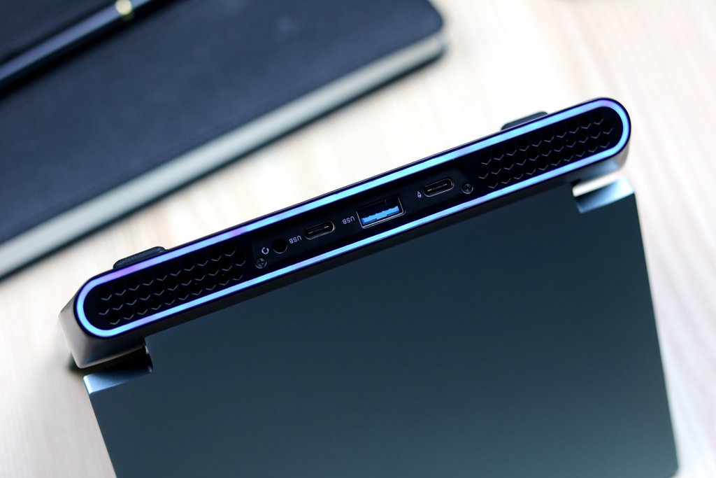 尾部的設(shè)計也是這款筆記本的一大亮點(diǎn)之一,雖然機(jī)器尺寸小,但還是在機(jī)身里面塞下了兩個散熱風(fēng)扇,搭配雙純銅熱管組合,通過尾部的兩個出風(fēng)口進(jìn)行散熱。這樣設(shè)計的好處有兩個,一個是散熱效率大大提高,另外在雙手手持手柄打游戲的時候,散出去的熱量不會影響到手柄,體驗(yàn)很好。中間是電源接口、兩個USB接口(包括一個Type-C)以及一個耳機(jī)接口。