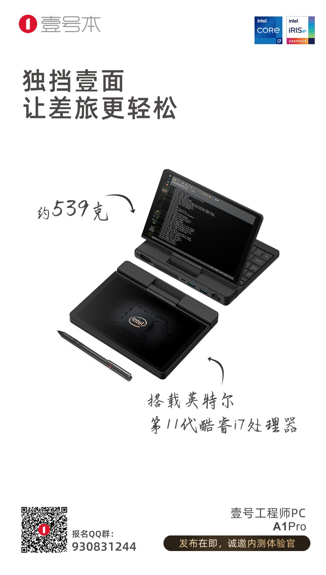 從壹號本官方發(fā)布內(nèi)測信息中,新品將最高可搭載Intel第11代酷睿 i7處理器,重量僅約539克。