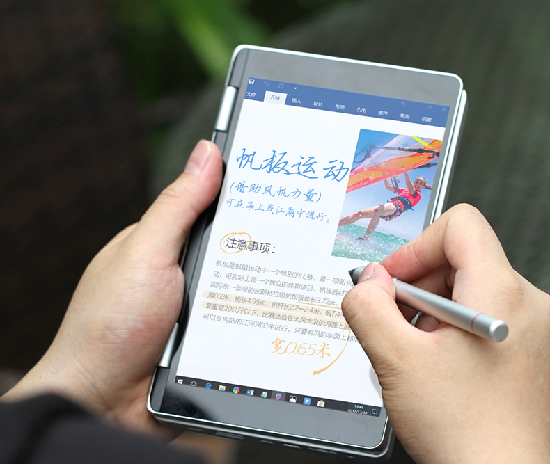 這款機器主打商務辦公輕娛樂,采用了英特爾四核處理器凌動X5,而內存搭載了8GB,硬盤128GB,這樣的配置對于辦公來說非常足夠了,還能夠偶爾玩玩小游戲。這款口袋筆記本雖然機身小巧功能卻很齊全,擁有背光鍵盤,鍵程1.3mm,敲打文字還是方便的,其次壹號本OneMix還可以360°隨意翻轉,這就很驚喜了,隨時隨地可變成平板模式,同時配備著一支手寫筆,可以在文檔上面直接寫出原筆跡,有2048級別的壓感體驗。